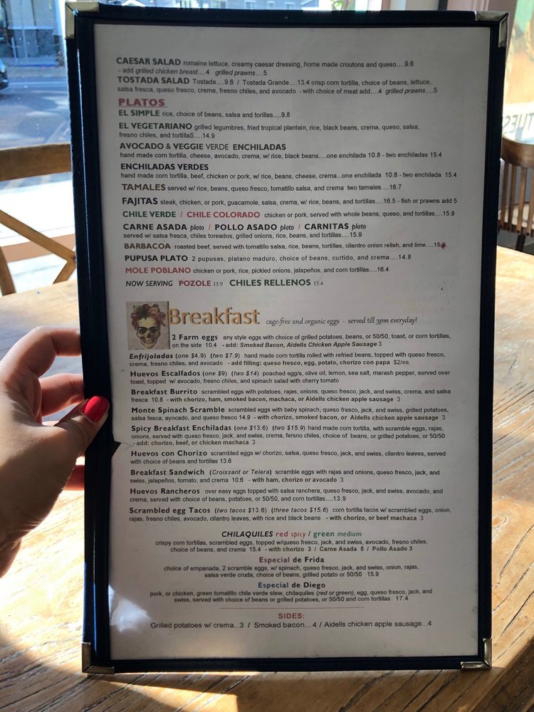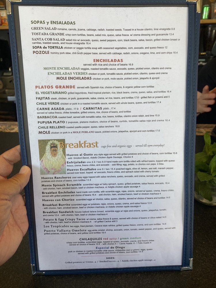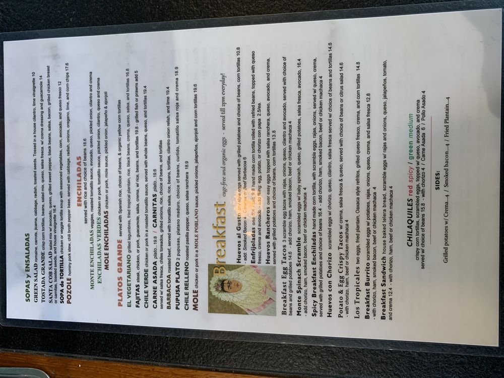 chorizo, potato empanada, 2 scramble eggs, w/ spinach, queso fresco, jack, and swiss, onion, rajas, salsa verde cruda, choice of beans, grilled potato or 50/50